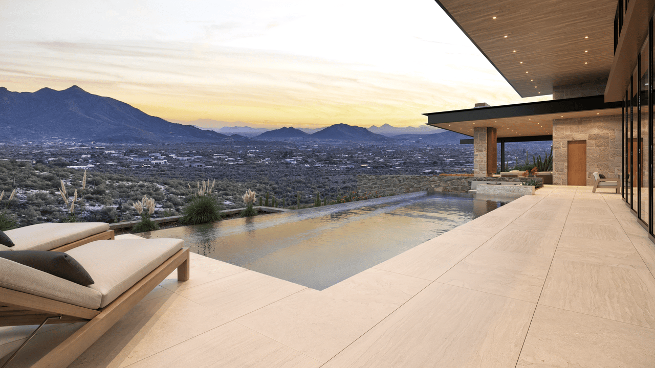 A gently sloping meandering driveway leads to the Guest Arrival and culminates in a Private Autocourt and 4-Car Garage. The home’s undeniably impressive presence felt curbside, is immediately reinforced upon arrival, with 18-foot Ceiling Heights throughout the Main Entry and Primary Living Spaces. A 55-foot-long pocketing glass wall system opens the entirety of the Great Room and Dining Room to the outdoor living spaces, infinity-edge swimming pool, and sunken firepit, all giving way to the panoramic mountain vistas beyond. Natural stone, steel, and wood finishes coexist with clean lines and thoughtful details, creating spaces that are as bold as they are refined.